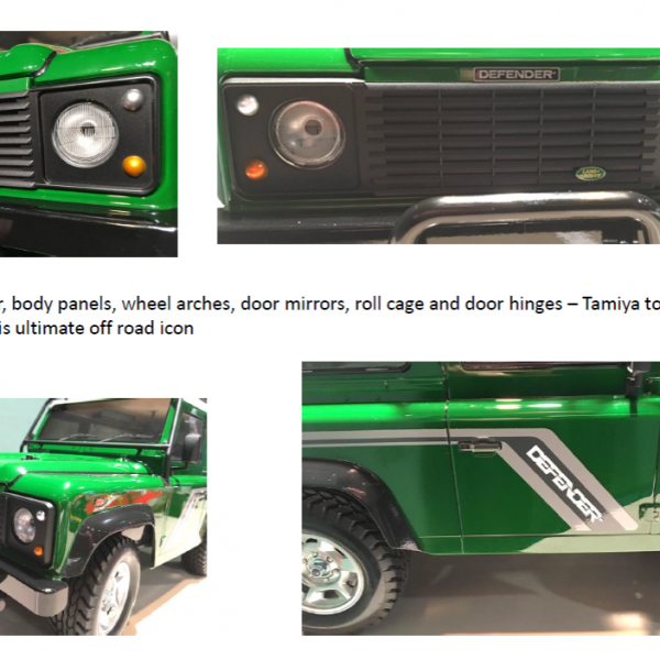 CC-01 Chassis is Tamiya’s ultimate platform for mounting precise scale renditions of off road classics. With built in wheel arches, sealed front and rear gear boxes with precision engineered differentials and shaft driven 4WD via universal joints, it replicates all the rugged realism of the Defender 90 – As such it is the ultimate platform to carry this iconic body, Lights, radiator, body panels, wheel arches, door mirrors, roll cage and door hinges – Tamiya totally capture the spirit of this ultimate off road icon